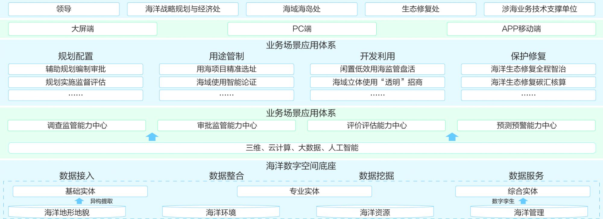 面向海洋空间治理全业务链,统筹数据整治、技术能力集成和应用组装,实现数据、平台、应用的一站式服务和一体化贯通,支撑数字化资产的持续迭代与沉淀,促进节约集约建设。