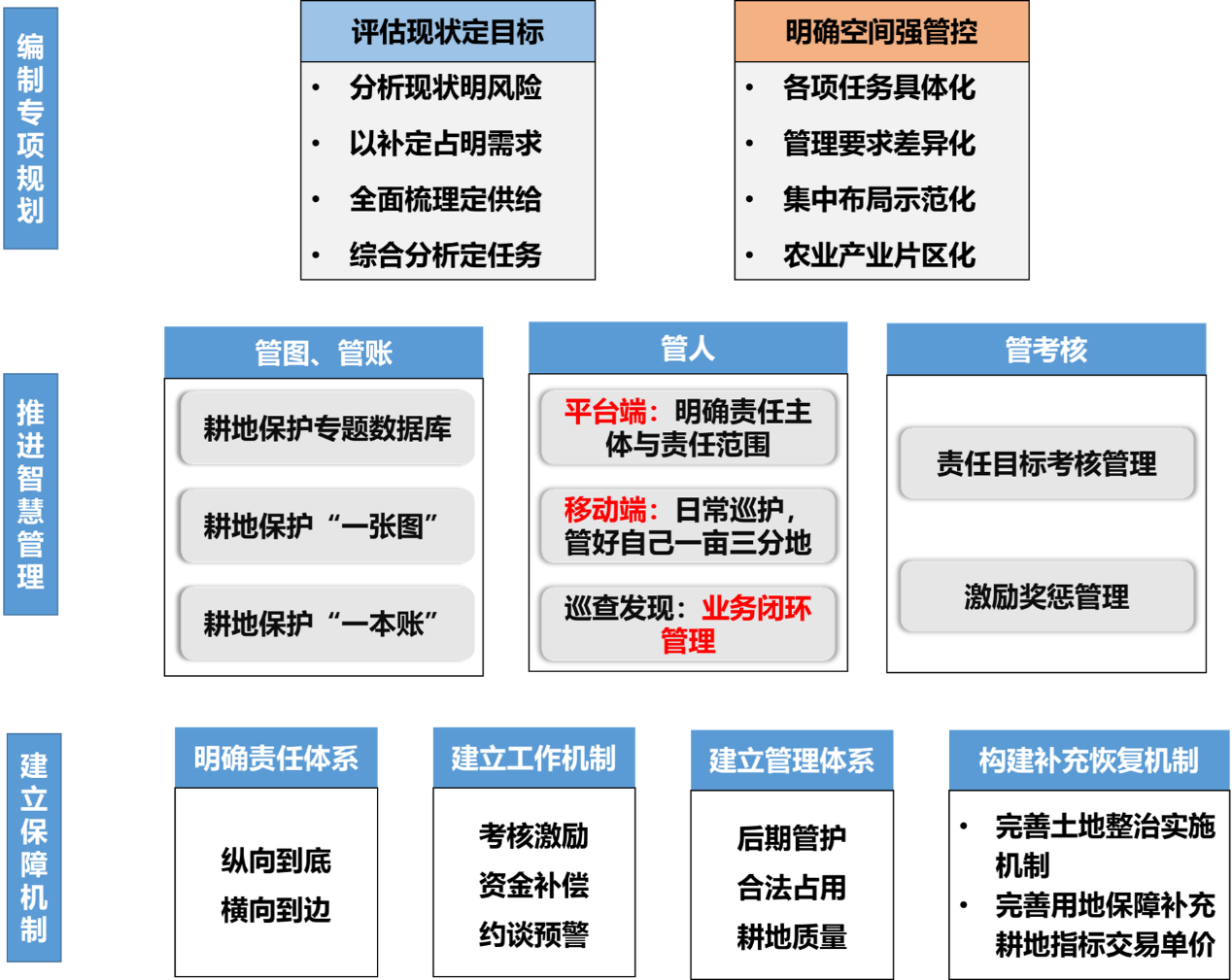 面向新形势、新要求的耕地保护工作,以智慧管理平台为基础,嵌入实施机制、专项规划明确的任务、目标、管理边界与对象等,推进耕地的全生命周期管理。一是管人管事,明确责任主体与范围,开展日常巡查、发现疑似问题并做好闭环管理。二是管图管账,摸清耕地家底,动态掌握耕地变化,并且精准辅助决策。三是推进智慧考核包括责任体系落实本身的考核、耕地保护和粮食安全责任制考核,并基于考核的结果落实激励奖惩管理。