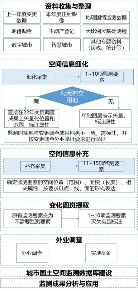 以上一年度国土变更调查成果为底图,结合国家下发的上一年度城市空间监测数据、地理国情监测数据,以收集的与监测要素相关的各类专题资料和当年度高分辨率遥感影像为指引,利用多种技术手段,结合实地调查,通过细化采集、补充采集、调查核实等方式,确定相关监测要素的位置、占地范围和相关属性等;构建城市空间监测数据库,并对相关数据进行汇总分析;逐级报省级和国家级核查,最终汇总形成本年度城市空间监测成果。